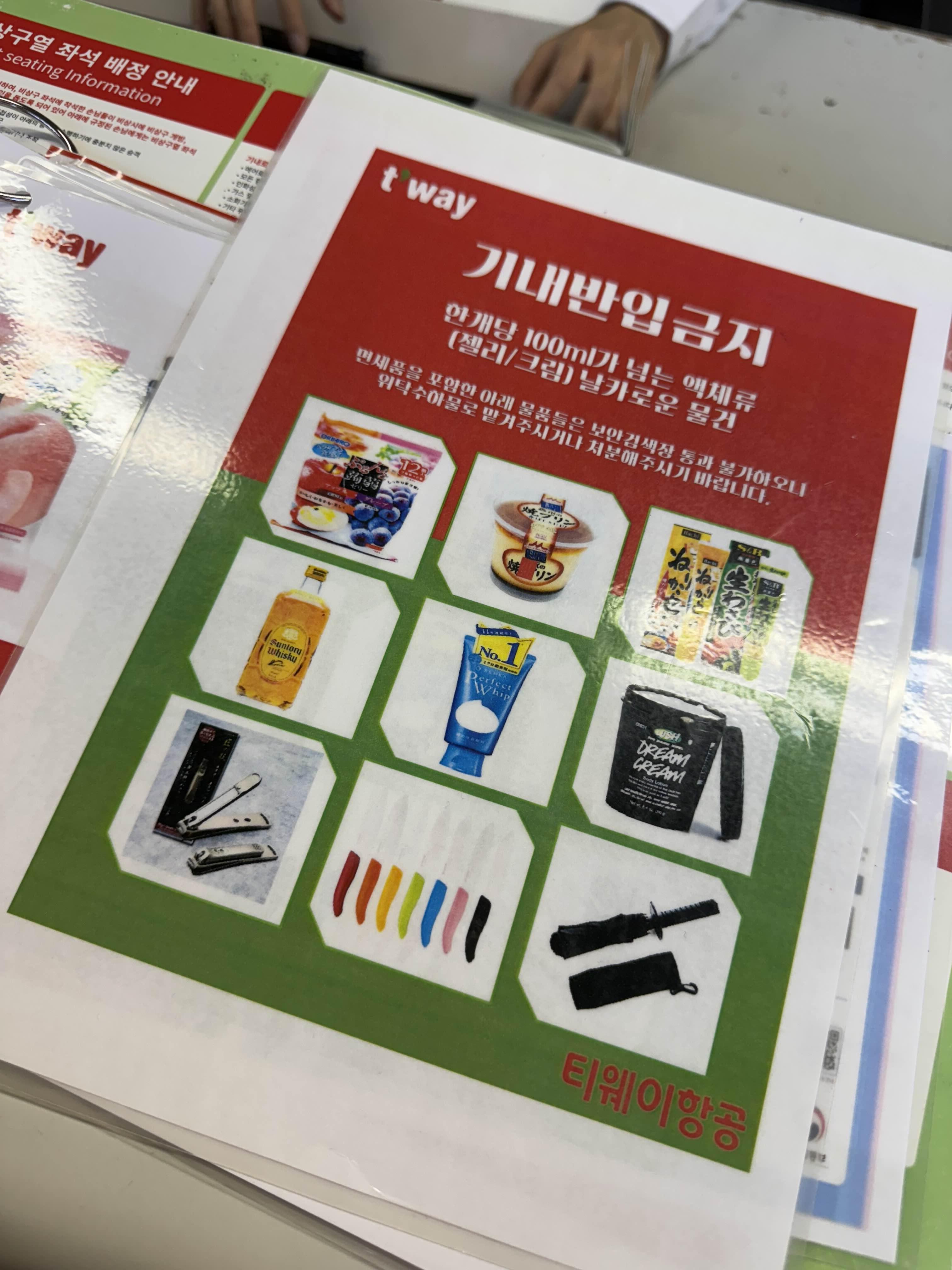 모든 액체류는 총 1리터 크기의 투명 지퍼백에 담겨야 하며, 한 사람당 지퍼백 1개만 허용됩니다.