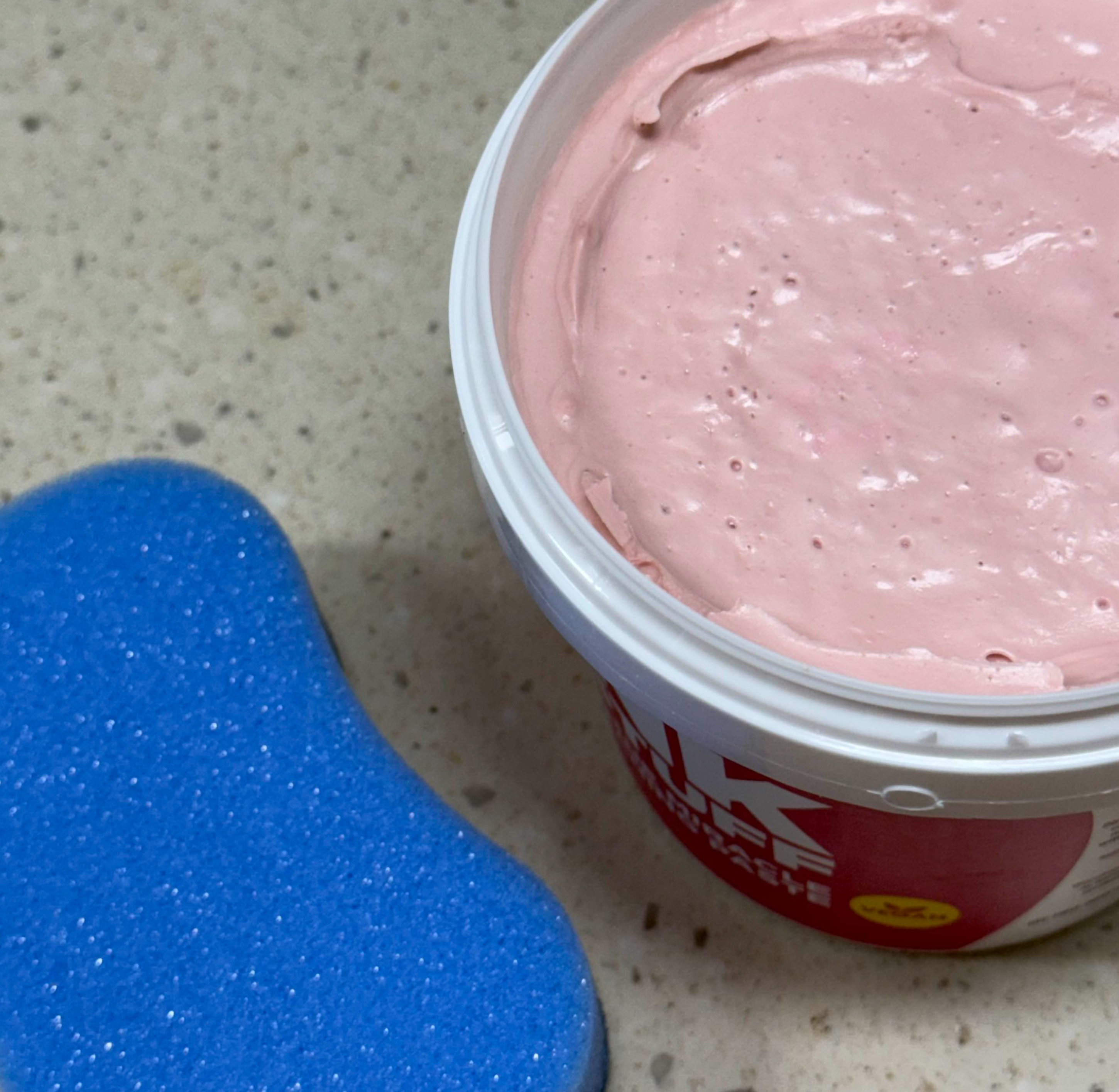 눈에 띄는 핑크색 통에 가득 들어있는 페이스트