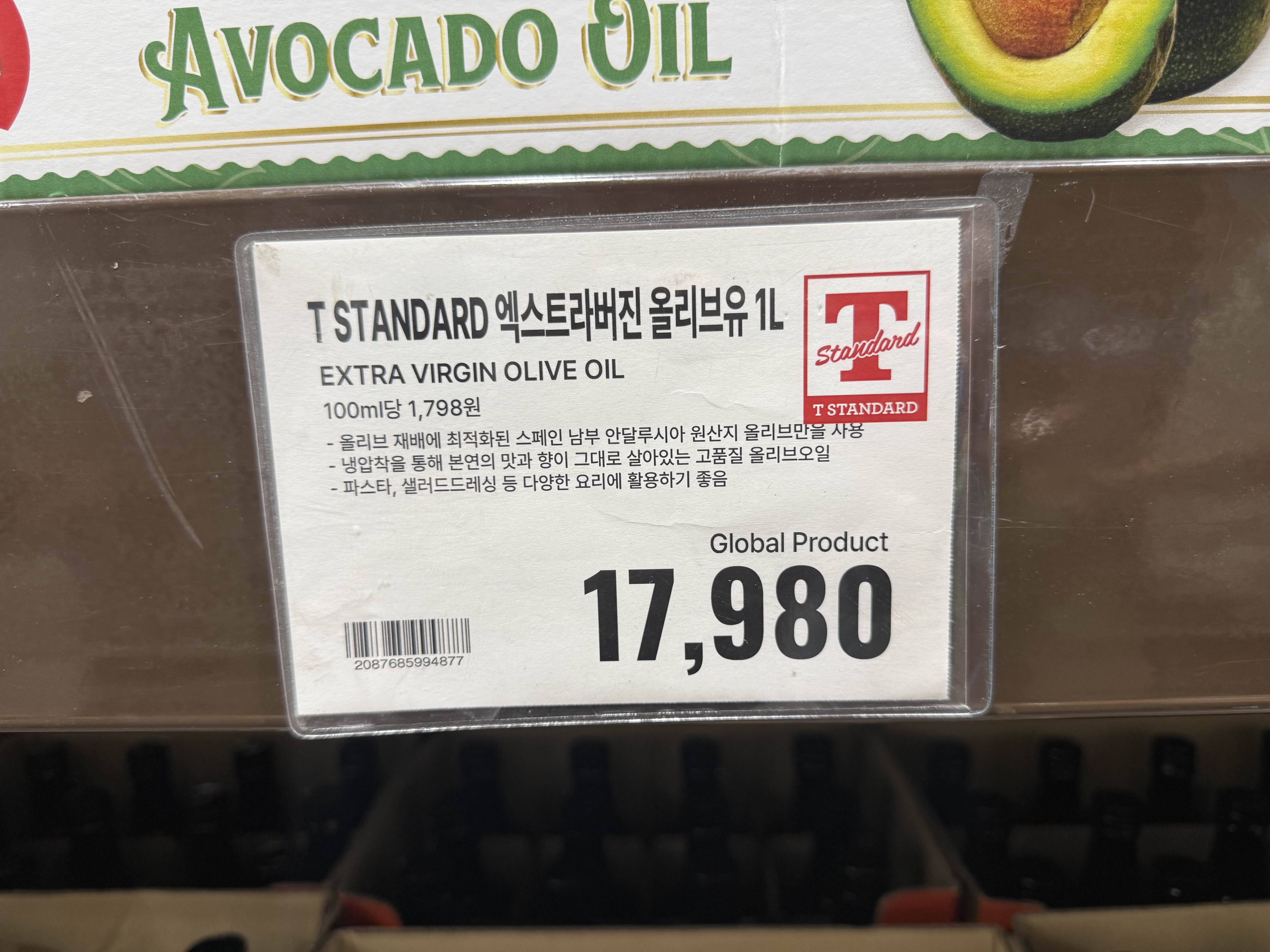 트레이더스 PB 브랜드로 알려진 T 스탠다드 올리브오일은 대용량 대비 합리적인 가격이 강점입니다. 산도가 0.6% 수준으로, 엑스트라버진 등급 중 중간 수준의 품질에 속합니다. 향이 강하지 않아 파스타나 볶음요리에 잘 어울립니다. 단일 원산지 스페인 제품으로, 가성비와 실용성을 동시에 갖춘 제품입니다.